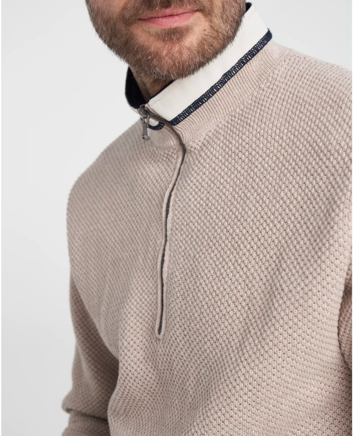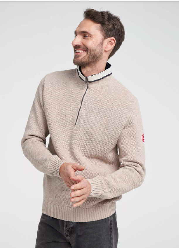 Wind-lined knitted sweater 100% cotton. Structured knit with woven details on the collar. Short zipper and normal to generous fit. Ribbed cuffs at the bottom and at the sleeve ends. The sweater has a windproof elastic lining consisting of 96% polyester and 4% elastane. No chemicals are used to achieve the windproof function. Instead, the lining is manufactured with a special weaving technique that makes the fabric extremely tightly woven and therefore also windproof, while the fabric breathes. The elastane makes the fabric stretchy, which means that it stops the wind but not movement. The lining is labeled with ÖKO-tex® Standard 100, which guarantees that the fabric is free from harmful substances. Sustainably produced in Europe.